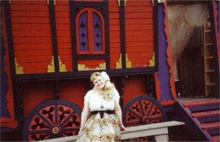 Here is Lily sitting at her gypsy wagon, in front with the stage and in the back where they prepare and rest.
