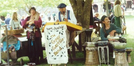 The first is a Scottish bagpies band. (I thought the guy without the shirt was cute! He was funny, too.) And the next is a gypsy band. The lady on the left is playing a psaltery like Lily plays, and the man in the center is playing a large dulcimer like Stevie now plays. Then there's the drums...Hmmm, maybe we should get a guy in the Willows to play the drums, eh?