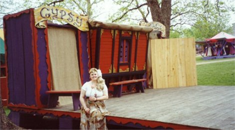 Here is Lily sitting at her gypsy wagon, in front with the stage and in the back where they prepare and rest.